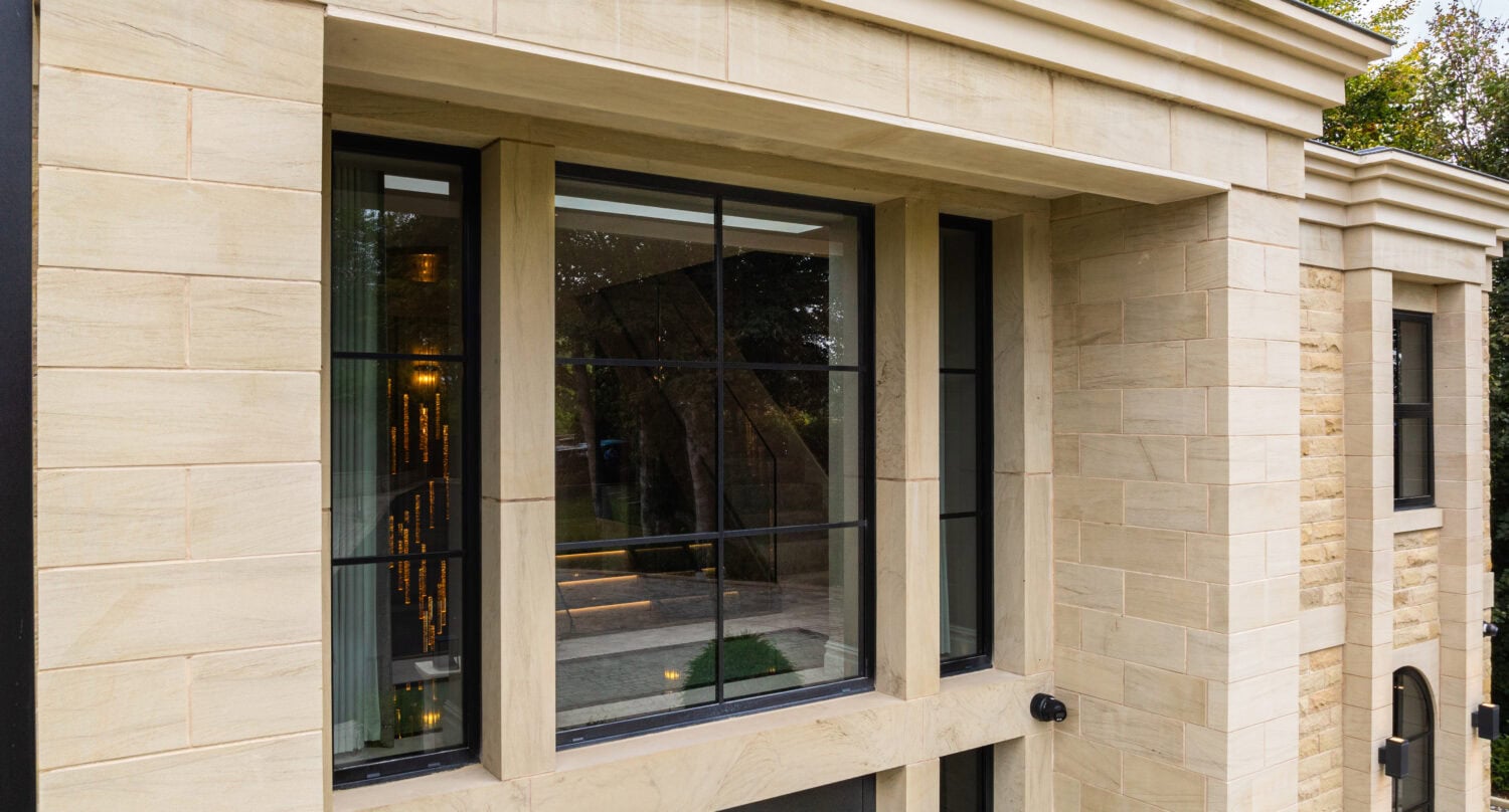 The second property is just as grand but with a more contemporary feel to its counterpart. The entrance still acts as a central feature with a huge pivot door, but this has been installed into stone surrounds, with separate sidelights, and the same sized glazing directly above but with astragal bars to create the popular steel look.