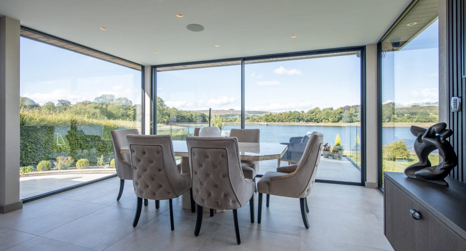 The newly extended open kitchen, living and dining area is nothing short of stunning. Panoramic glass walls at various angles ensures that space feel light and bright while allowing the water and woodland to form the natural backdrop to the space.