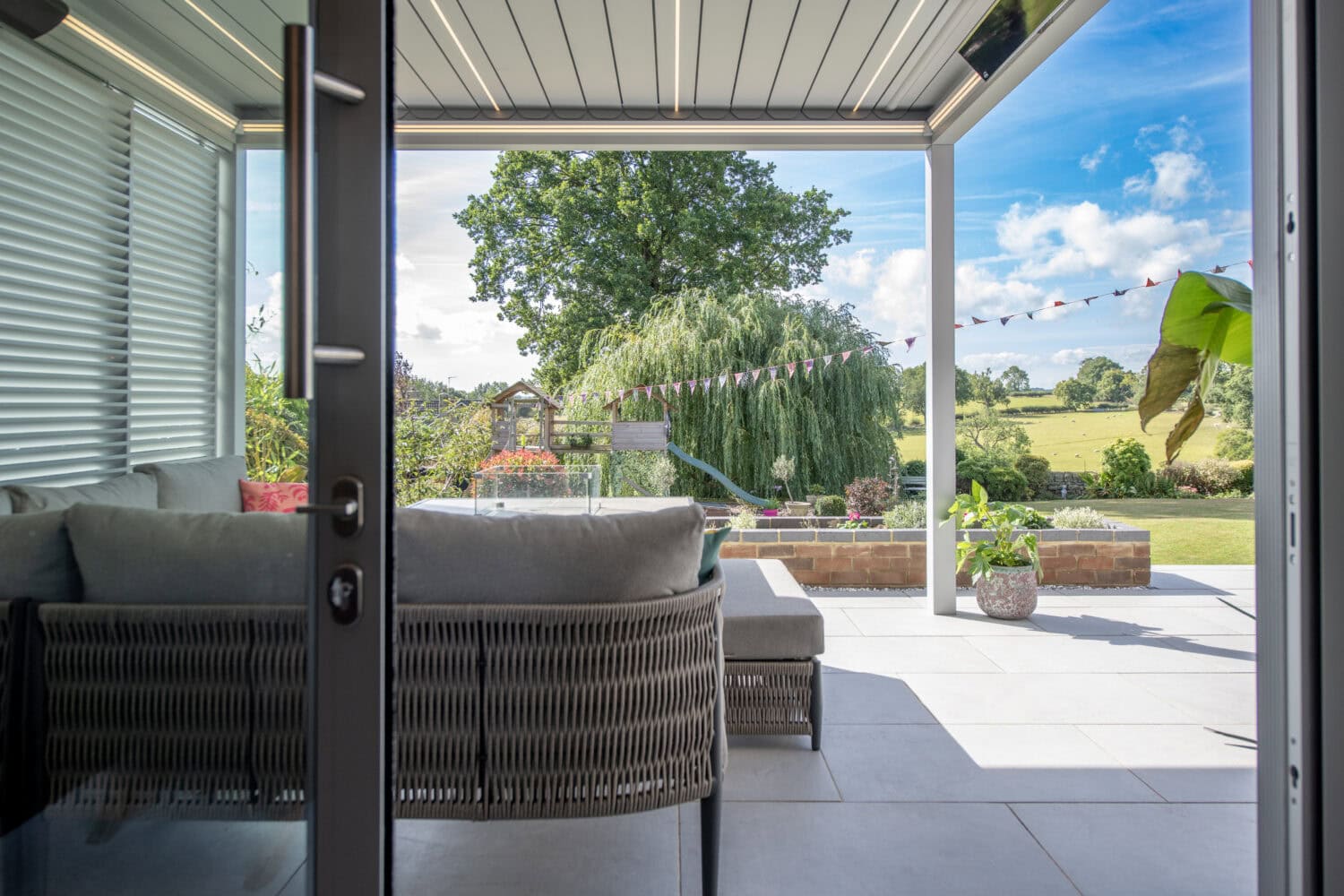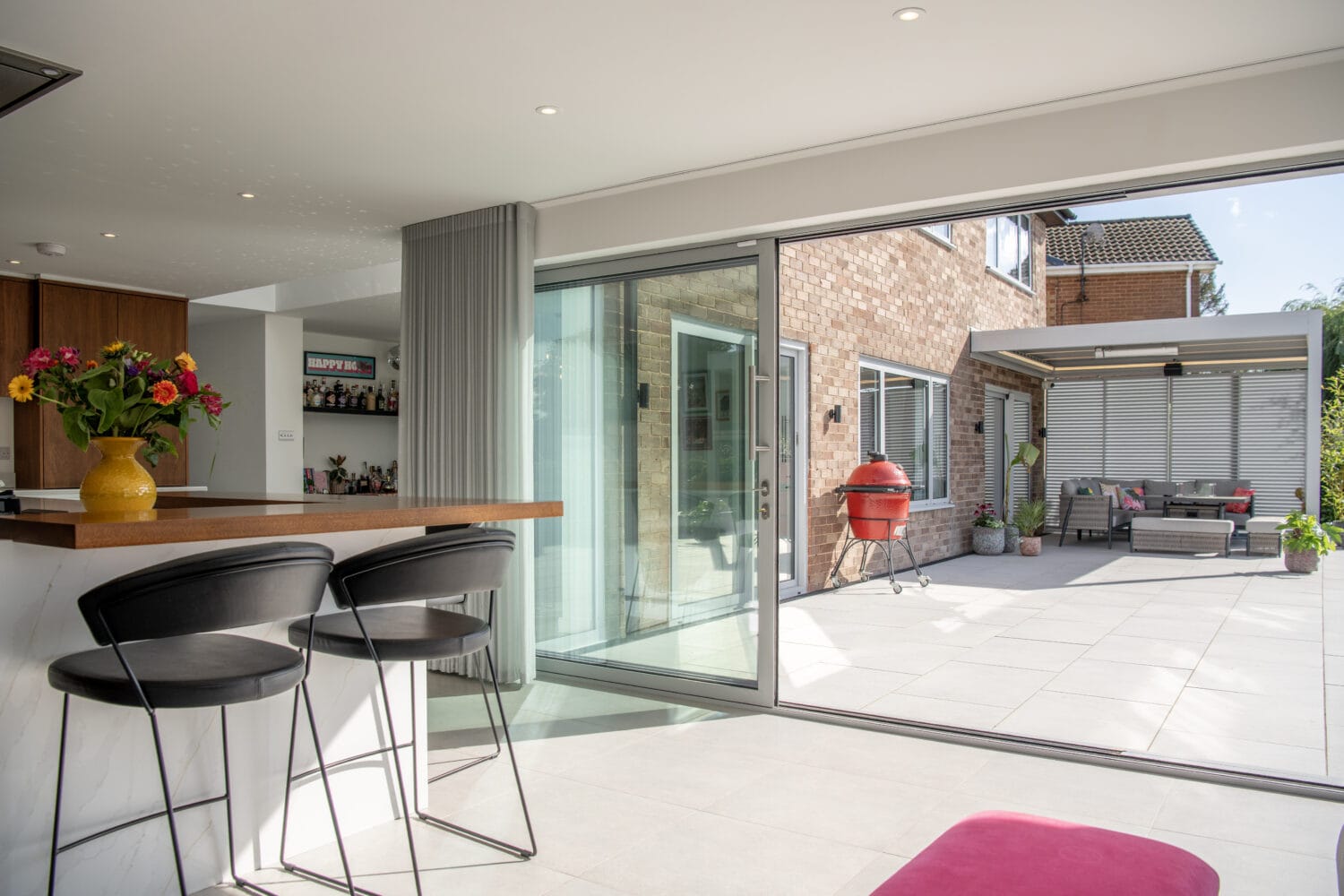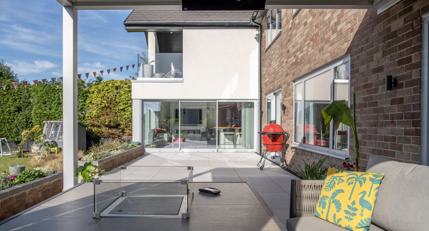 The design of the space is themed around open connection with three sets of rear sliding doors all opening out onto a large patio area that leads down to the garden. Enthused with their new outdoor space the homeowners returned to our sister company Exterior Spaces to purchase a new bioclimatic pergola that is connected to the house wall and screens off the outside space from the neighbours.