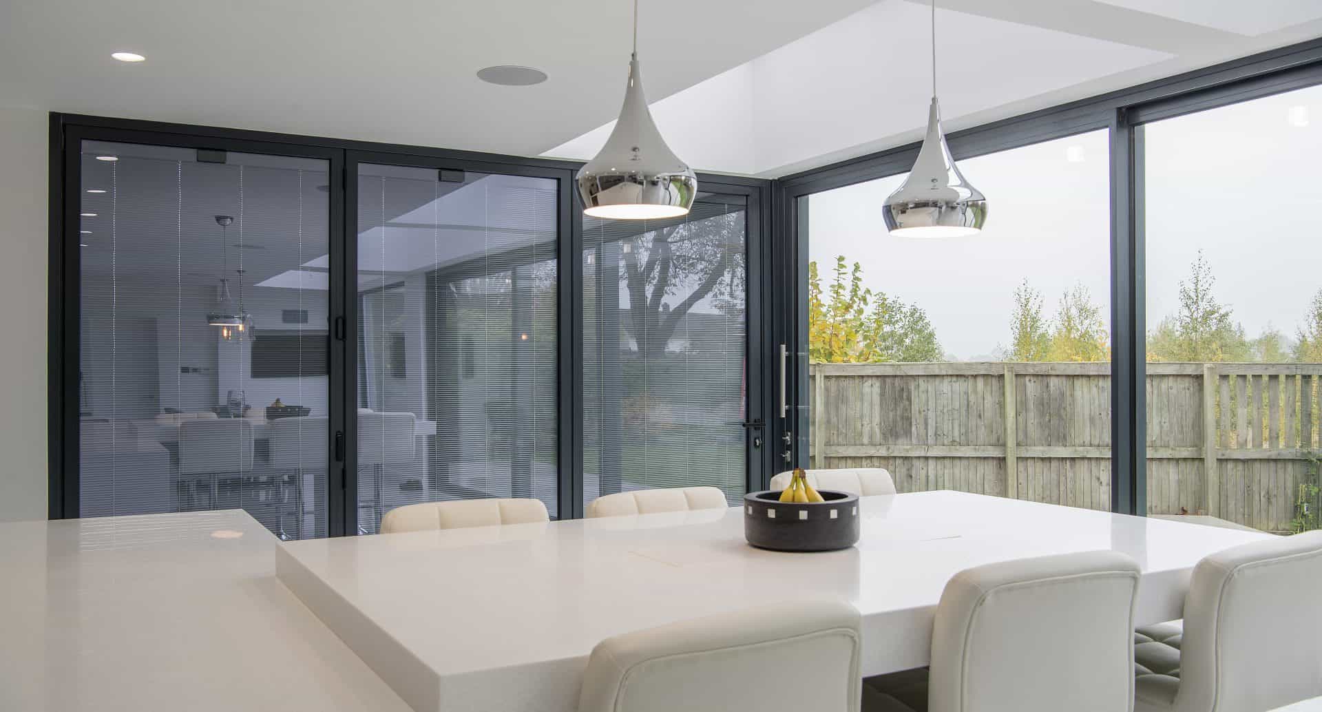 The bi-fold doors are maximised with the largest folding panels possible meaning expansive glass and minimal frames. For a smooth transition indoors to out, the bifold door opens away from the sliding door, creating an impressive open corner effect. The solar power blinds within the bi-fold door require no hard wiring and can be operated at the touch of a button, they also fold away conveniently within the door and never need cleaning.