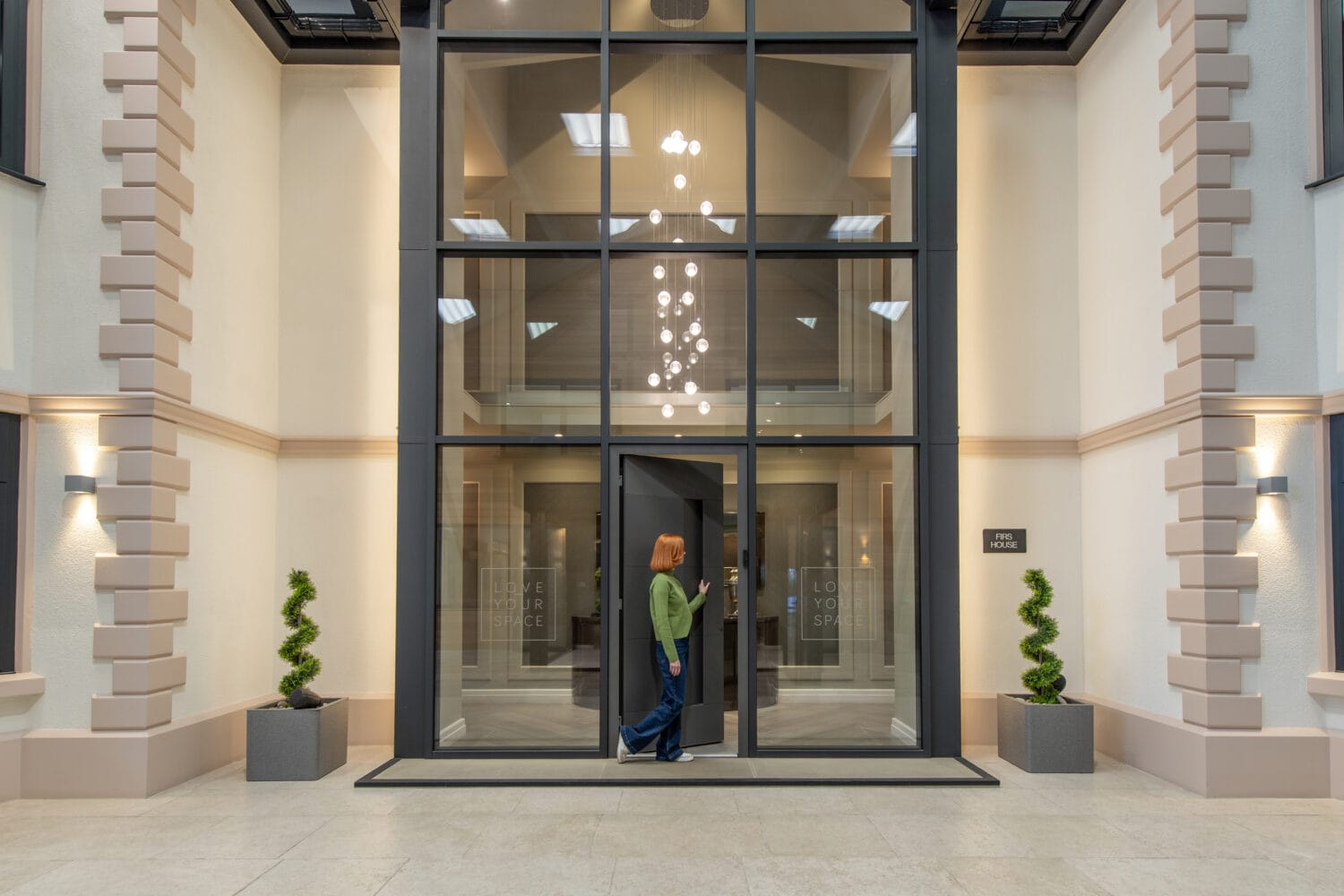 Two huge house front displays dominate the ground floor with an atrium designed showcase our pivot doors and panoramic glazing alongside a curtain-walling entrance atrium to demonstrate the quality of our premium front door range and the statement entrances they can create within any home.