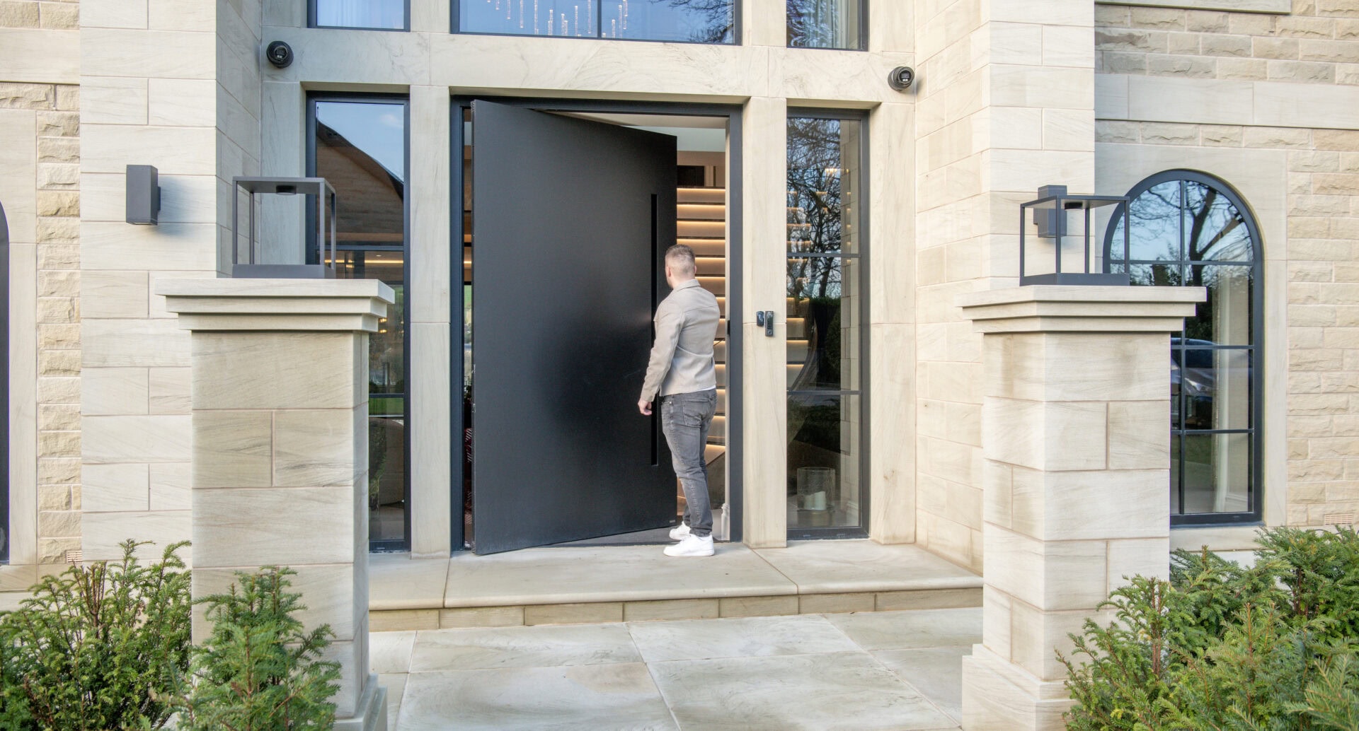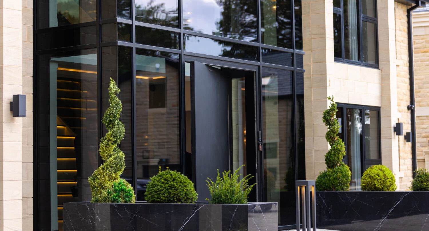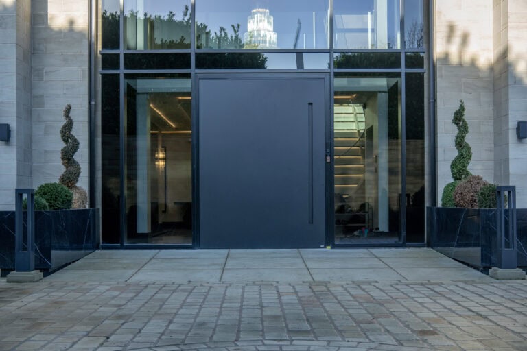 Pivot doors are designed for warmer climates as the pivot action does not have a typical rebate to close against, meaning the wind loading isn’t as good as our traditional opening entrance doors. For this reason we recommend having the pivot doors set back and protected by an external overhang like a veranda or canopy. Incorporating this into the frontal design of any property brings the benefit of a statement entrance door with proper UK weather protection.
