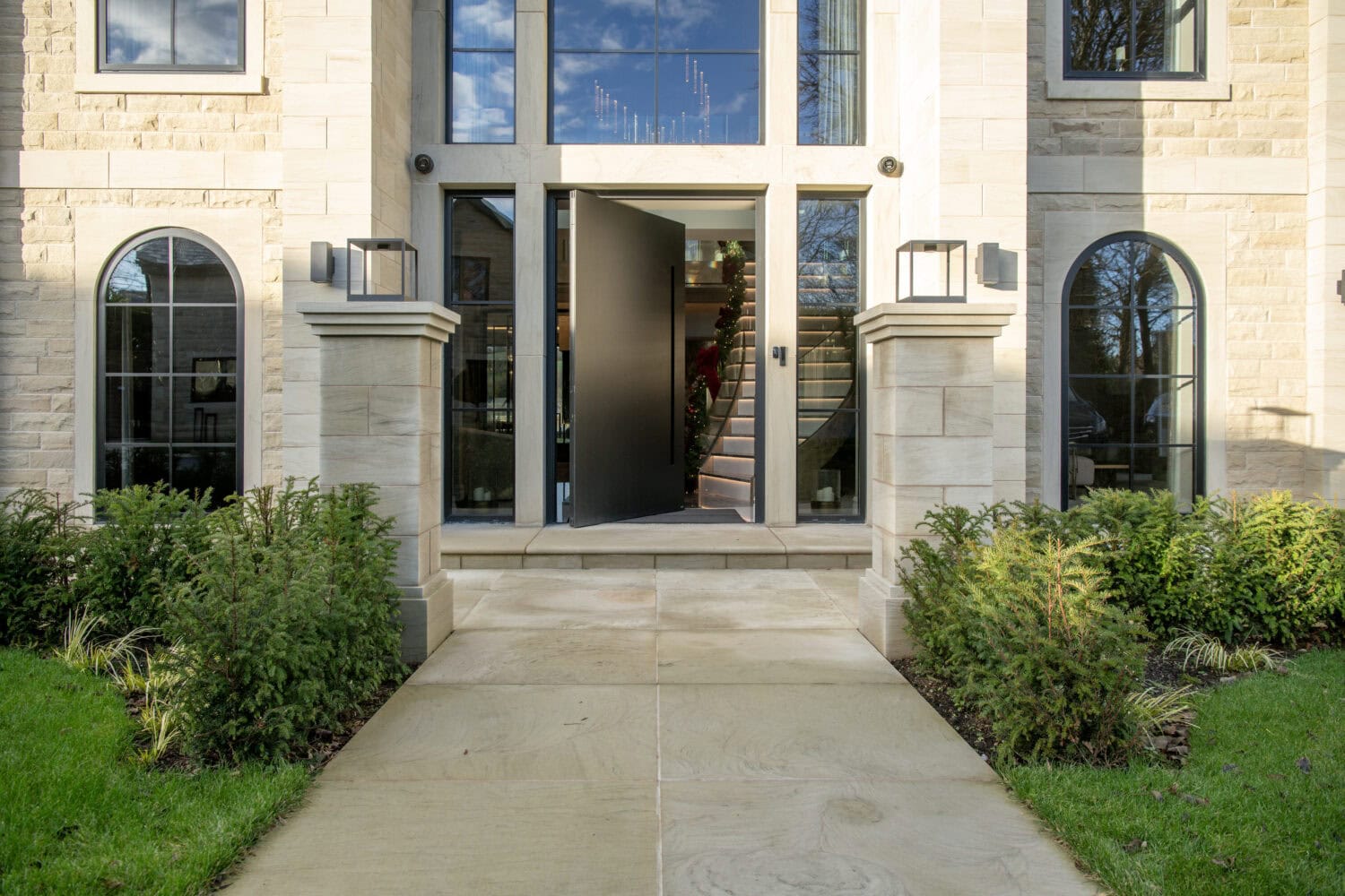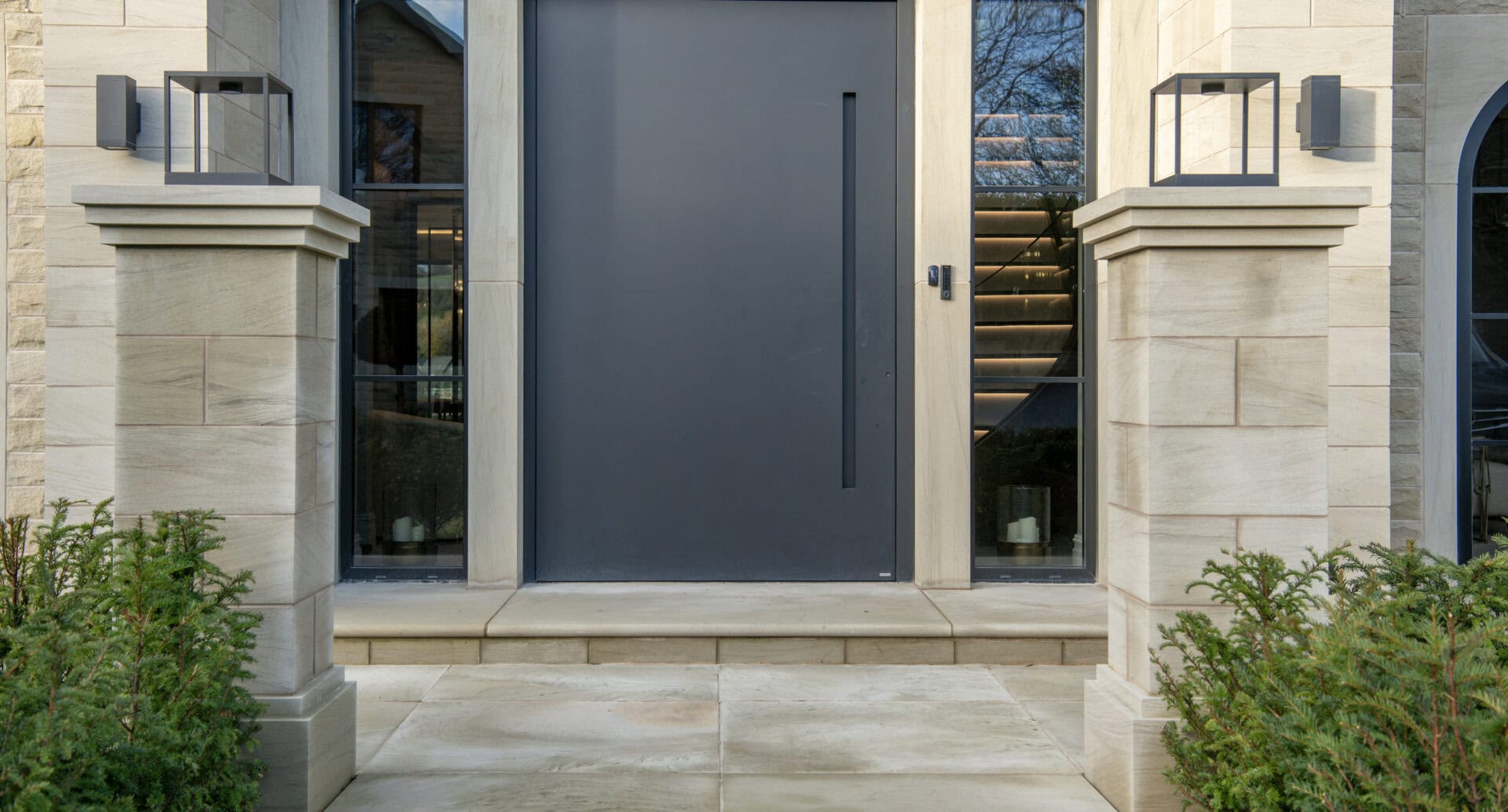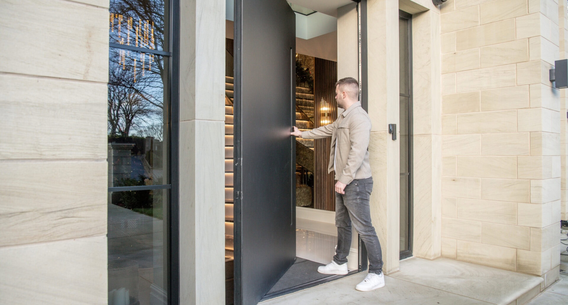 Pivot doors are designed for warmer climates as the pivot action does not have a typical rebate to close against, meaning the wind loading isn’t as good as our traditional opening entrance doors. For this reason we recommend having the pivot doors set back and protected by an external overhang like a veranda or canopy. Incorporating this into the frontal design of any property brings the benefit of a statement entrance door with proper UK weather protection.